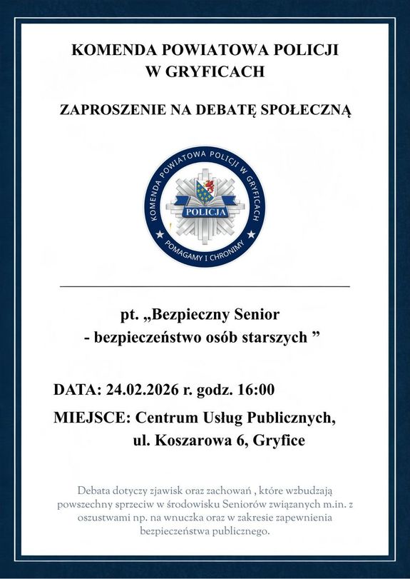 Komenda Powiatowa Policji w Gryficach zaprasza wszystkich na kolejną debatę społeczną „Bezpieczny Senior- Bezpieczeństwo osób starszych”. Będzie to już kolejne spotkanie w formie debaty ewaluacyjnej, które odbędzie się 24 lutego 2026 roku (wtorek) w Centrum Usług Publicznych przy ulicy Koszarowej 6 w Gryficach. Początek o godz. 16:00.