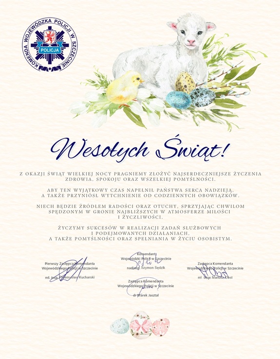 Życzenia Komendanta Wojewódzkiego Policji w Szczecinie oraz jego zastępców z okazji Świąt Wielkanocnych Dodano: 03.04.2026
