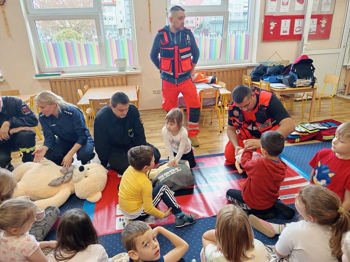 Policjanci, Strażacy oraz Ratownicy Medyczni po raz kolejny pokazali, jak ważne jest budowanie świadomości i odpowiedzialności już od najmłodszych lat. W ramach programu profilaktycznego "Bystry Przedszkolak" funkcjonariuszka spotkała się z dziećmi z Przedszkola nr 2 w Gryficach, aby porozmawiać o bezpieczeństwie i nauczyć ich podstaw pierwszej pomocy przedmedycznej. W zajęciach oprócz profesjonalnego sprzętu do udzielania pierwszej pomocy brał udział Miś Gustaw.